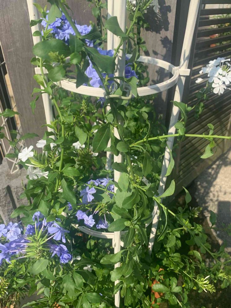 2年目の鉢植えのルリマツリ🤍💜2色の混植にしました。随分成長して枝が暴れるので、オベリスクに誘引してみたけど、うまくできない💦