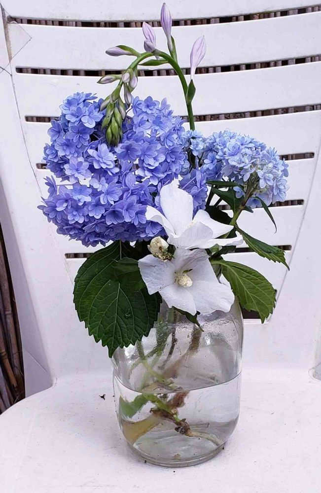ムクゲの白 紫陽花の青 ギボウシの薄紫 優しい感じで素敵です!