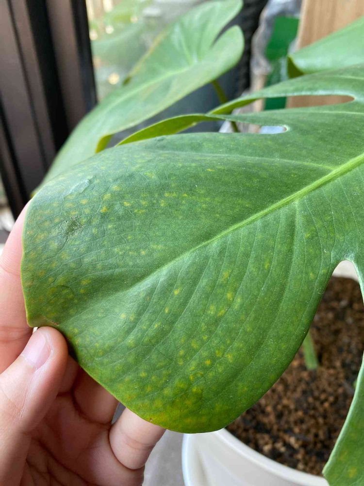 先日、モンステラを植え替えしてしばらく経ったのですが、葉っぱがこのように黄色いボツボツみたいな症状が出てきちゃいました😭