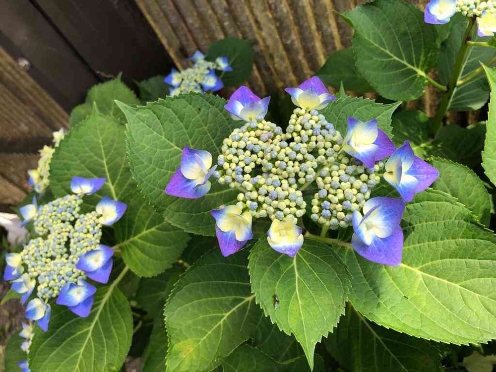 庭のガクアジサイ・ブルースカイが色づいてきました。