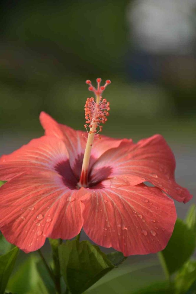 雨の朝。サーモンピンクのハイビスカス。🌺