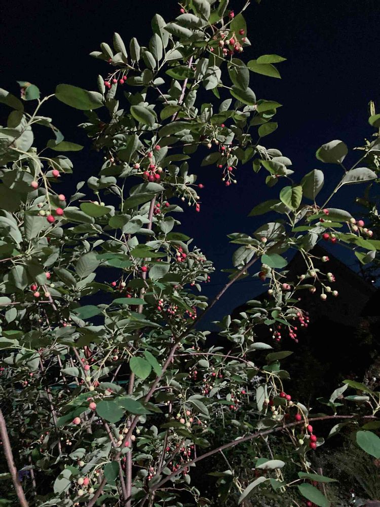 庭のジューンベリーが美しく美味しい季節。毎日目も口も楽しんでいます。夜もセンサーライトが点けば浮き出るこの姿。