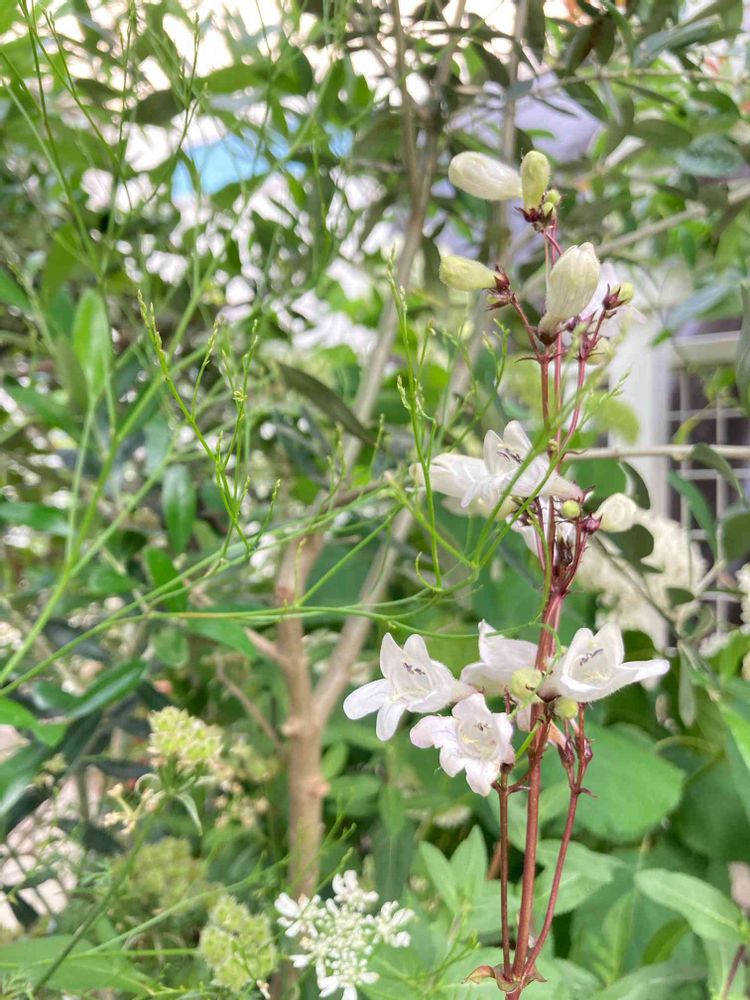 GSを見て良いなぁと思っていたペンステモン。少し前に憩いの農園で見つけました。実際に見ても、カッコいい赤銅茎に可憐なグリーンホワイトの鈴型のお花、お迎えして良かった。かすみ草が咲いたらもっと雰囲気でるだろうなとたのしみです。