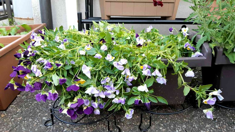 帰宅したら、暑さのせいでビオラの株が全倒れ!😱ここまで倒れたのは初めて見ました💦お水あげたので様子見…。