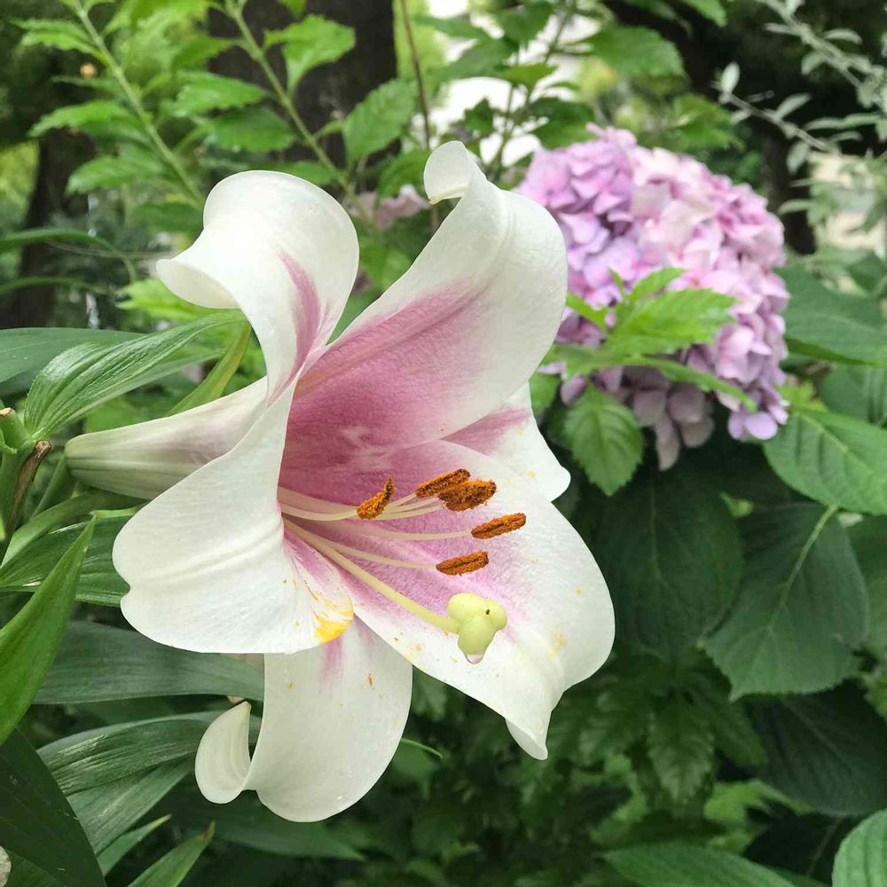 引き立つ百合に控えめに見える紫陽花