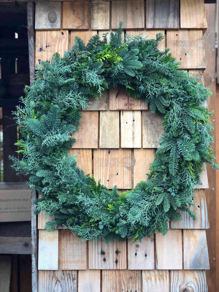 針葉樹だけの大きなリースのご注文で制作した5種類のコニファーを使用したグリーンカラーグラデーションリース。大きなリースなので色調の段階的変化がいい感じにデザインすることが出来て、Simple is beautifulなリースになりました