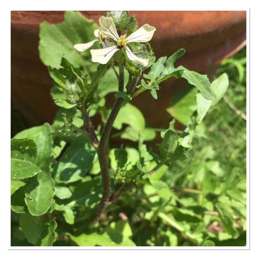 ルッコラの花がまた咲いてしまった。摘んでサラダに
