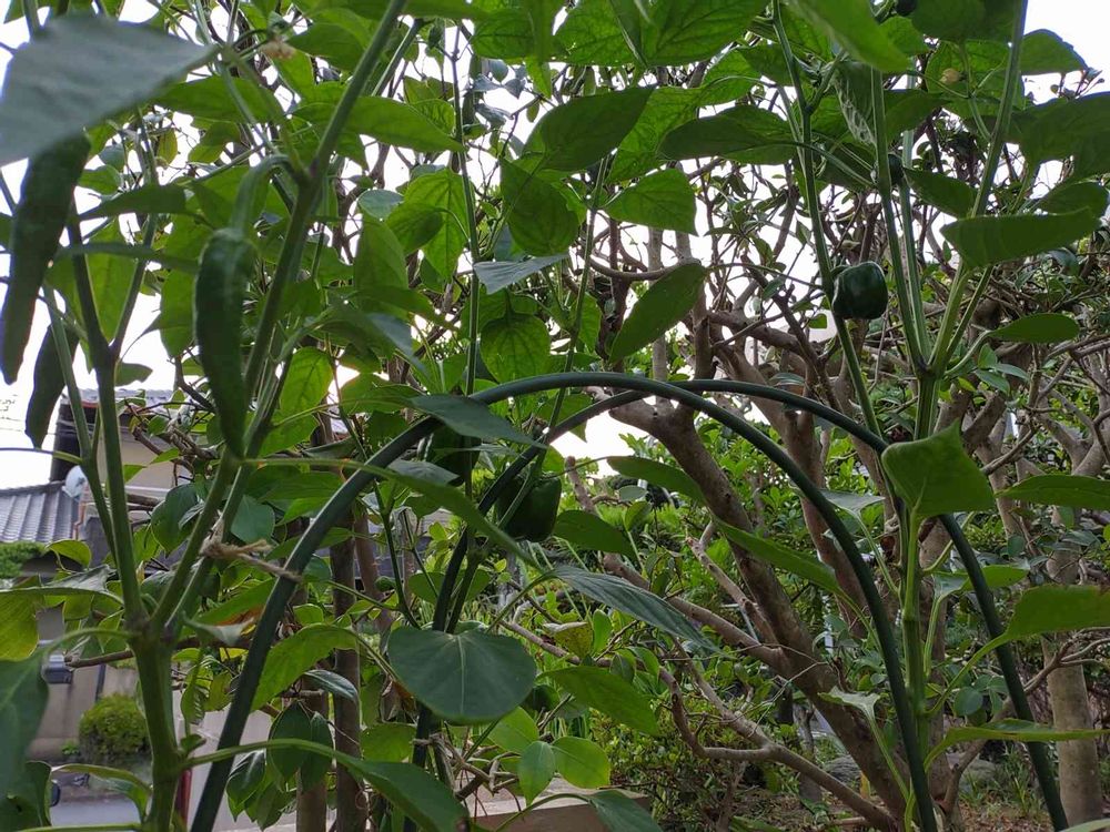 万願寺唐辛子と、パプリカです。雨が降ると受粉できずに実がならないらしい。