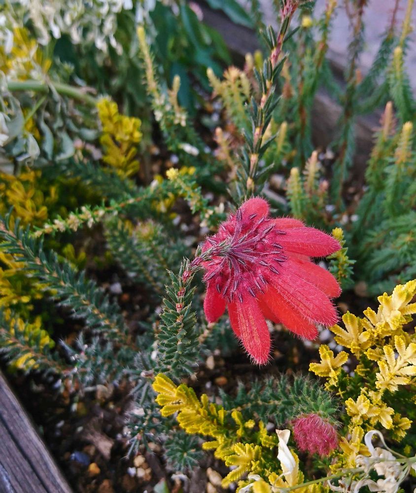本当の花はこの花弁みたいな形の筒の中なのに、こうやって垂れ下がる後ろ姿自体が既に花にも見える。そして名前もカッコイイ!これは昨日の白いエリカの赤いバージョン(*‘∀‘)最近の品種らしい