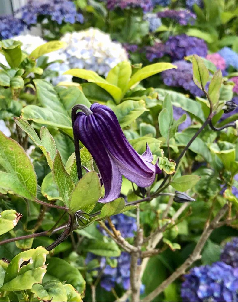 母がフェンス沿いの紫陽花よりにクレマチスの鉢を寄せたので、どのクレマチスも紫陽花の間から顔を出しています。