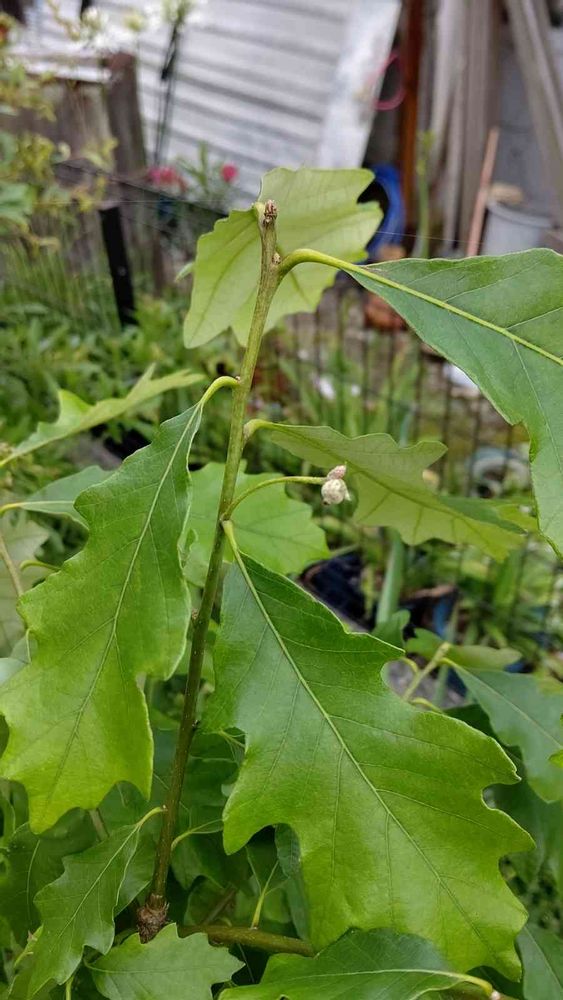 雄花は見てないし、ホワイトオークの仲間で雄花がついてるのも近くにないので、どんぐりにはならずこのまま萎れるんじゃないかと思います。