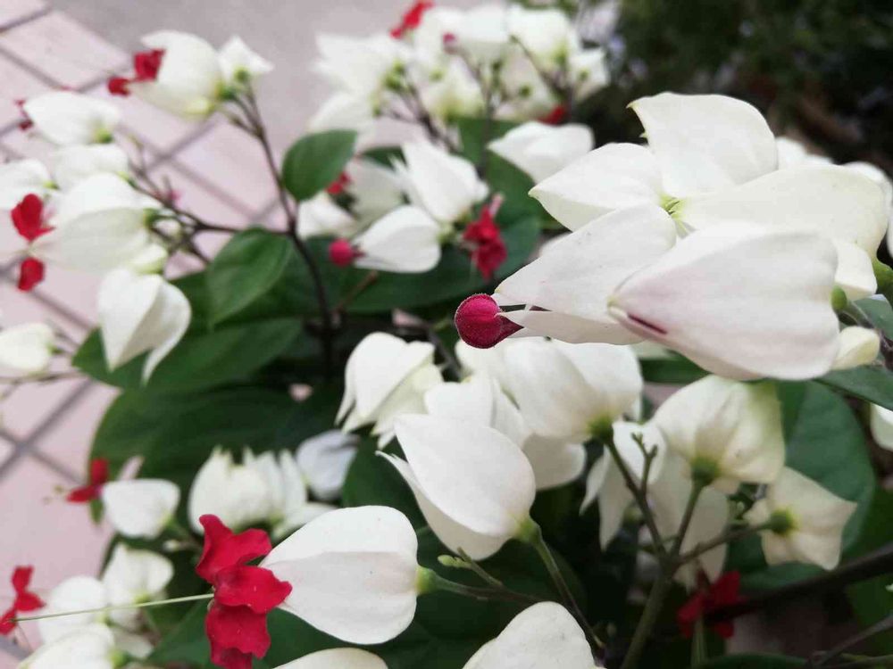 白いのは萼、赤い蕾玉が開き長いシベを伸ばし出します。