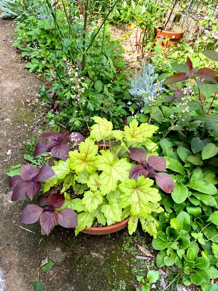 ヒユーケリラの鉢に赤紫蘇が生えてきて、渋い寄せ植えになりました。