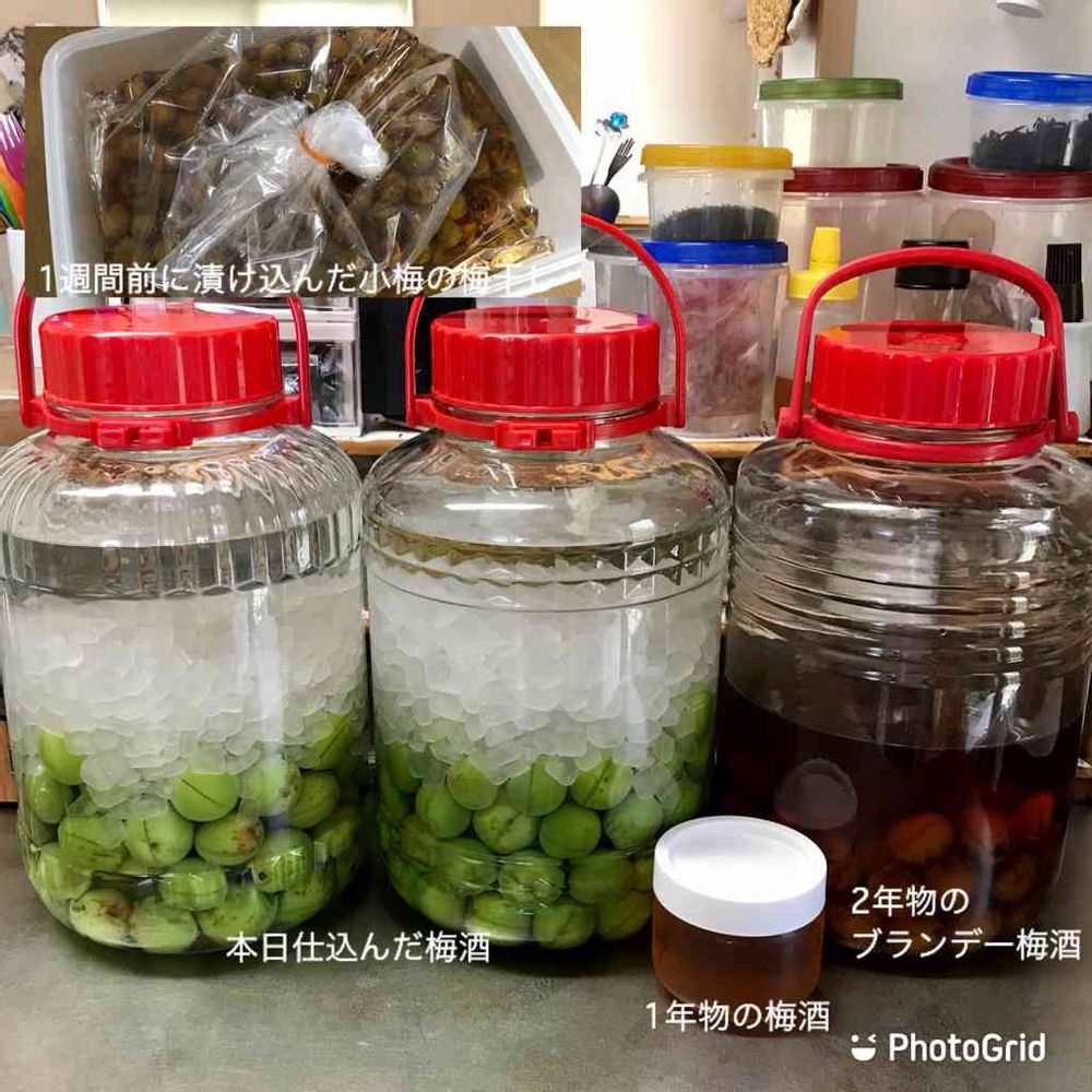 今朝採りの大梅を使って、8L瓶で梅酒🥃2瓶を仕込んでおいた。家🏠飲みばかりだったこの1年、在庫は極僅か😢、出来上がりの3ヶ月先まで持つかなぁ?🤔。1週間前に漬け込んだ小梅の梅干しは今のところ順調👍。