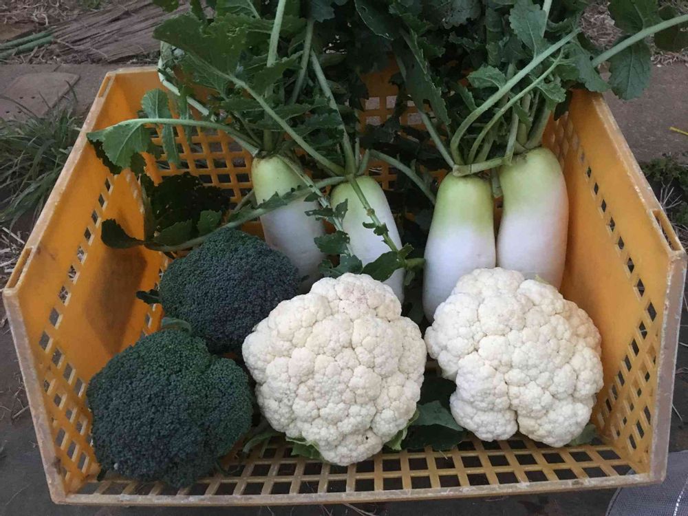 今日の収穫2ミニ大根4本、カリフラワー2個、ブロッコリー2個。