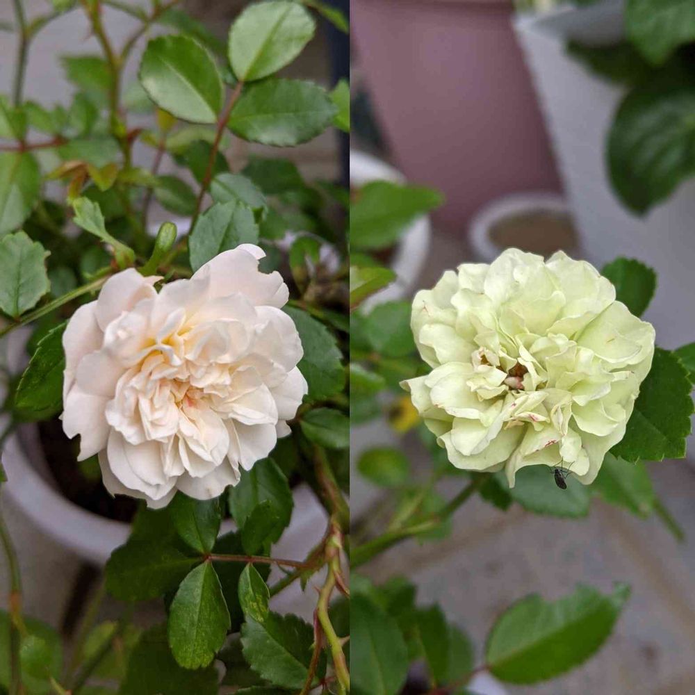 グリーンアイス、ミニバラですが咲き始めは薄いピンク色、その後白っぽくなって最後は薄い緑色になります。珍しい色のバラの割に育てやすいです。