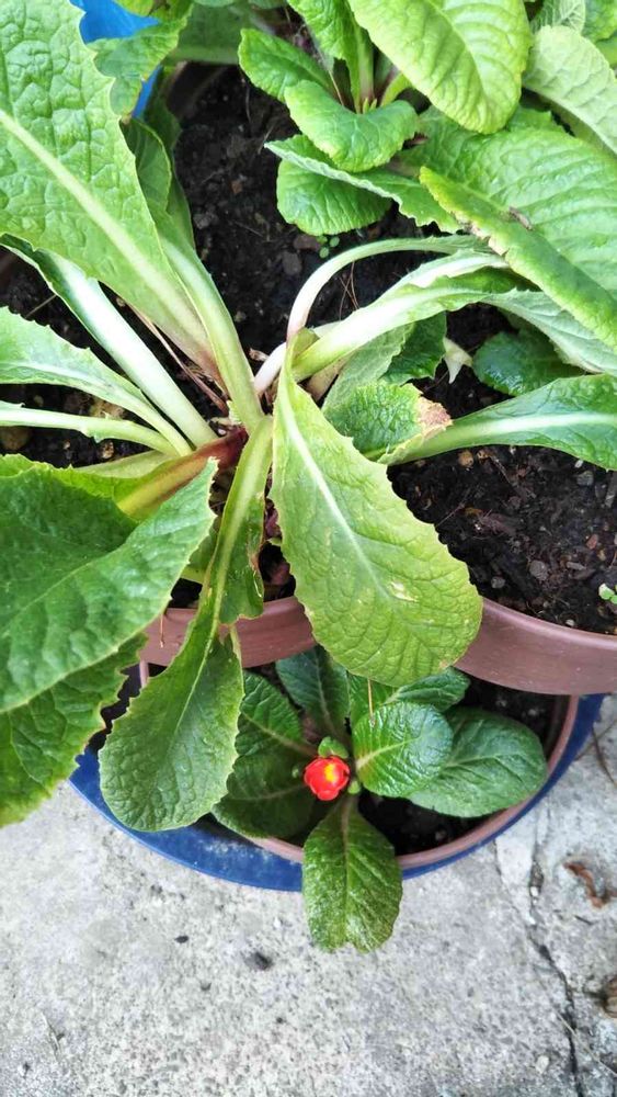 久しぶりに、ひっくり返して、見たら、赤いプリムラさんが、隠れて咲いてました。😊🙂😄