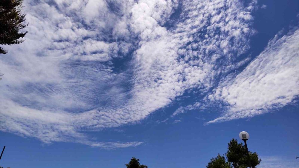 公園のハクウンボク(白雲木)の実を撮影して空を見上げると、公園と隣の駐車場から見える広い空一面にも真上にも白い雲が輪のように広がって見えました。