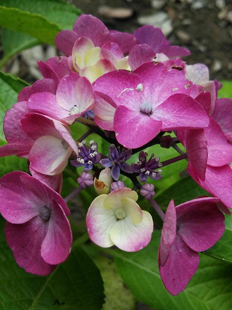 手毬咲き紫陽花、塊でみてたけど、よく見ると、別な花が咲いてる。