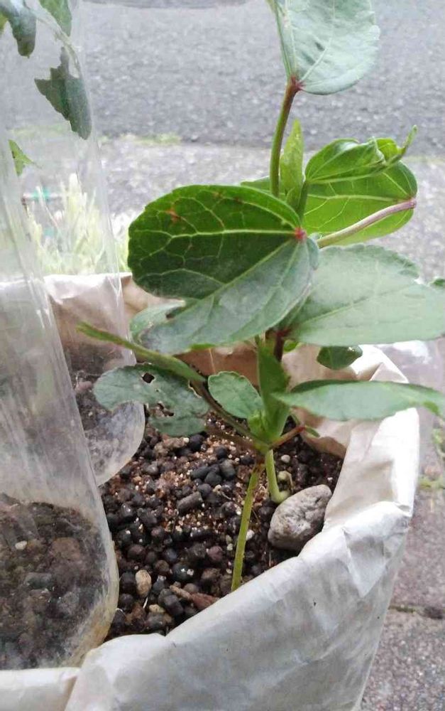 ローゼル、アップ⤴️しました。葉がボロボロです。ナメクジと大風にやられてしまいました。