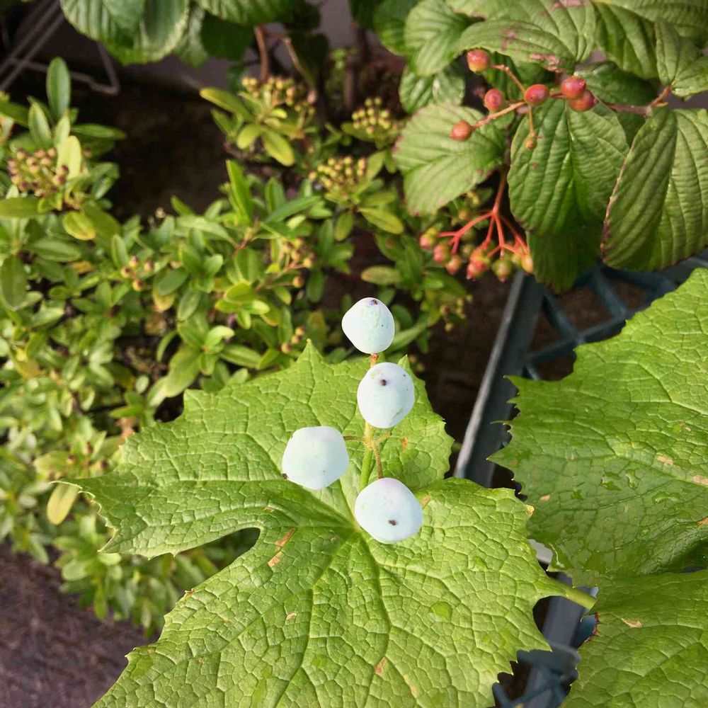 透明な花が有名なサンカヨウは実がついています。ラムネのような薄いブルーが美しい😍のですが写真にうまく表現できません。ミヤマガマズミとピラカンサの実を添えてみました。