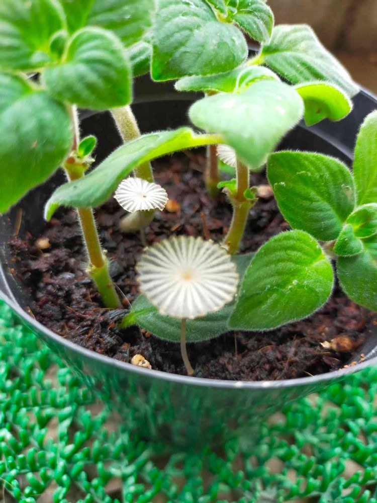 ストレプトカーパスの挿し木をしてたのですが その植えてた土から謎の植物が3つ出てきたのですが 半透明の傘みたいでかわいいのですが これ何でしょう❔