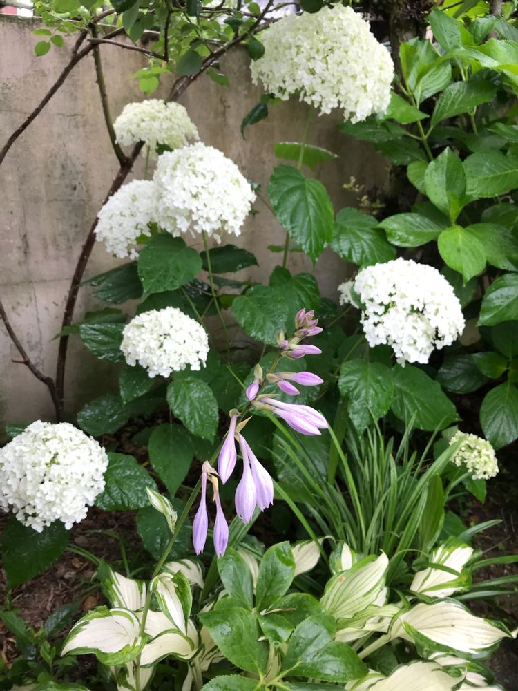 アナベルの白とホスタの薄紫の爽やかなコラボですね👍♬