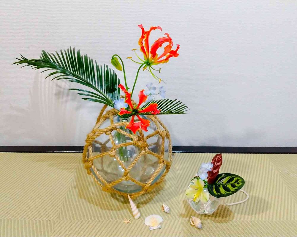 赤のグロリオサも花器が涼しげだから映えますよね〜🤗 しかも、大小セットでの浮き玉遣い、ありがとうございます😊