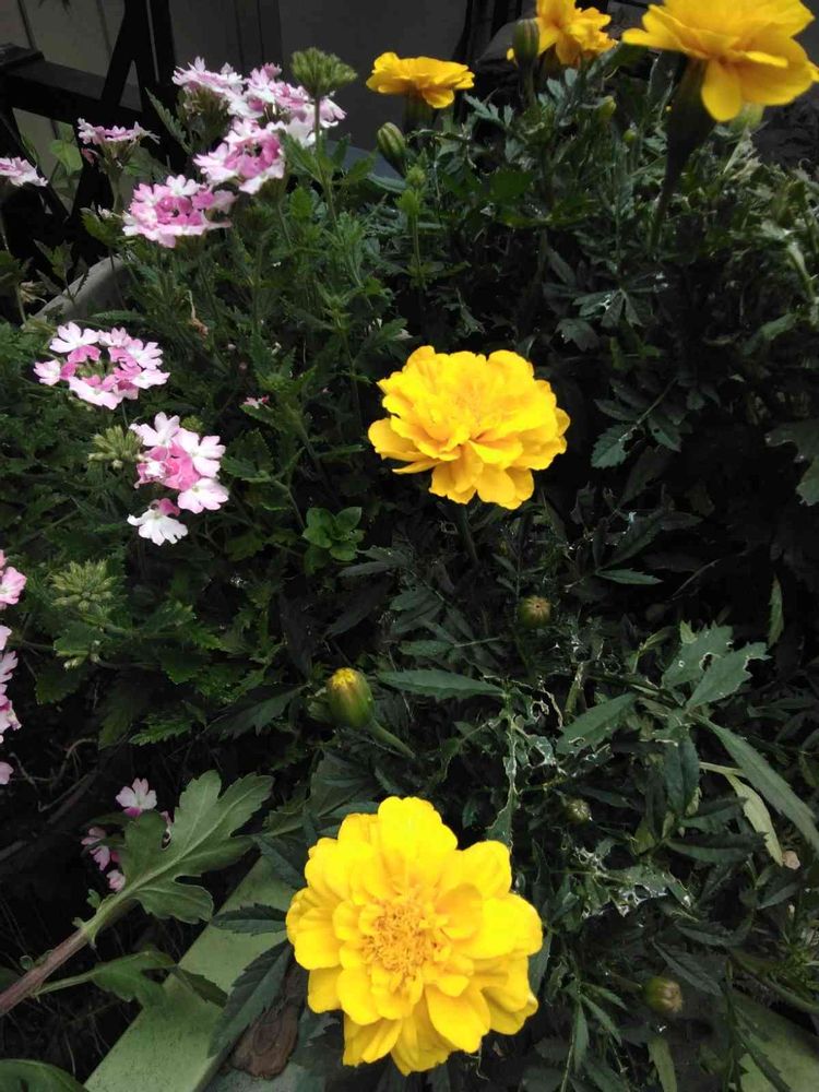 種から育ったマリーゴールド🌼と何年目かの宿根草バーベナ🌼色が可愛い。