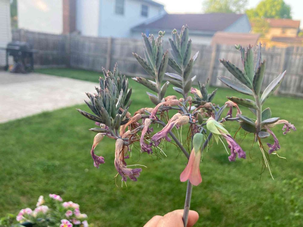 花が咲いてその上から新しい芽が出てきた不死鳥錦。