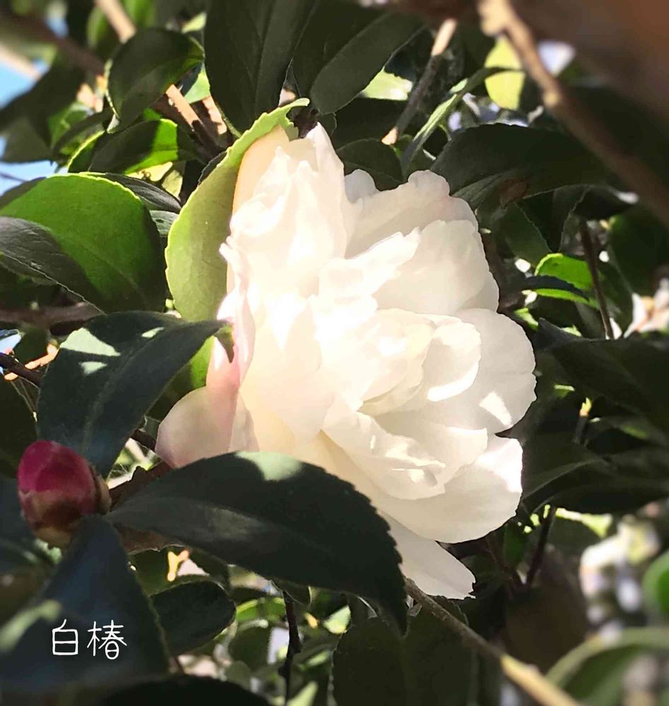 白椿。🌳樹齢20年になる大きな木✨葉っぱに隠れて数輪咲いてました❤️
