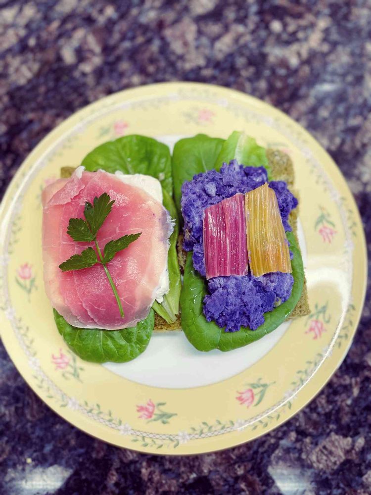 レタスサラダ菜、スイスチャード赤茎、スイスチャード黄茎、シャドークイーンとグリーンピースのポテトサラダと、クリームチーズ、生ハム、イタリアンパセリのサンドイッチ。キャベツ外葉練り込みパン使用。