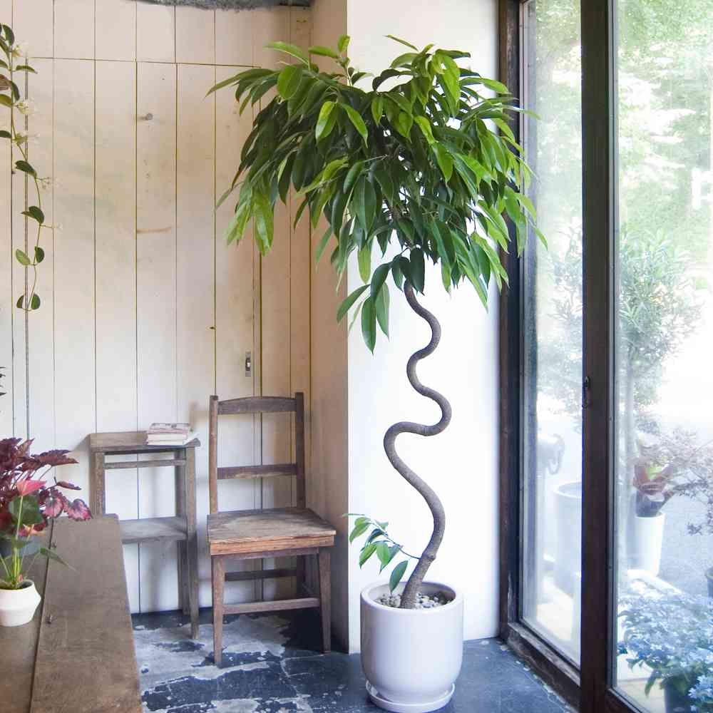 ショウナンゴムの木の改良種「アムステルダムキング」グニャグニャに曲げられた姿がユニークです。