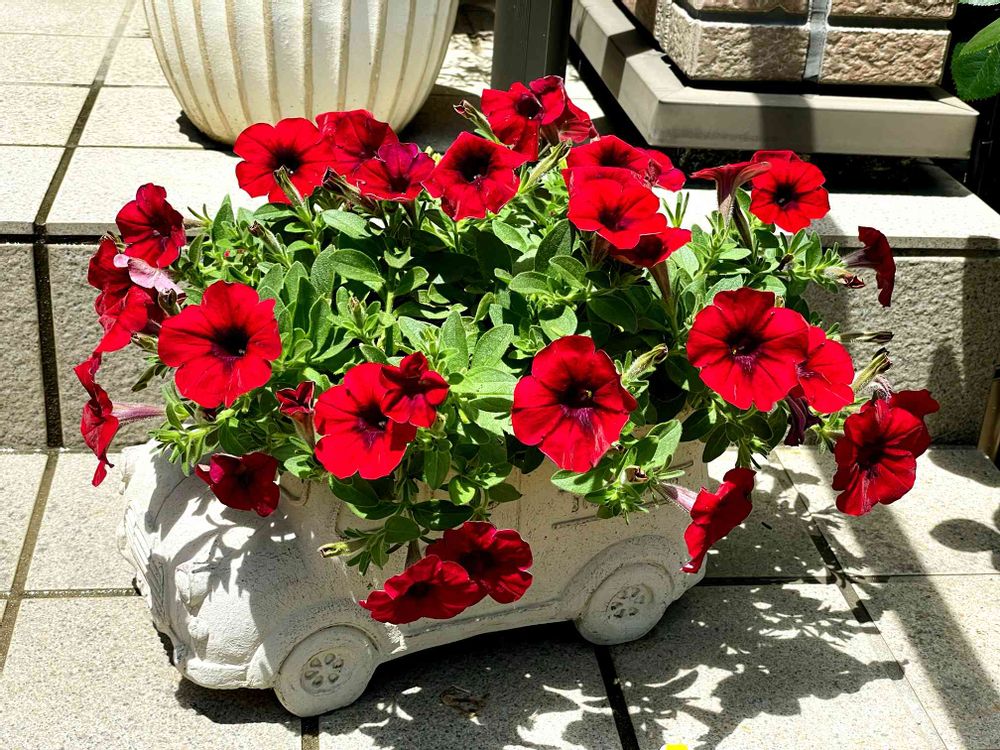 サフィニアが咲いてます。このままだと車が埋もれてしまいそうです。