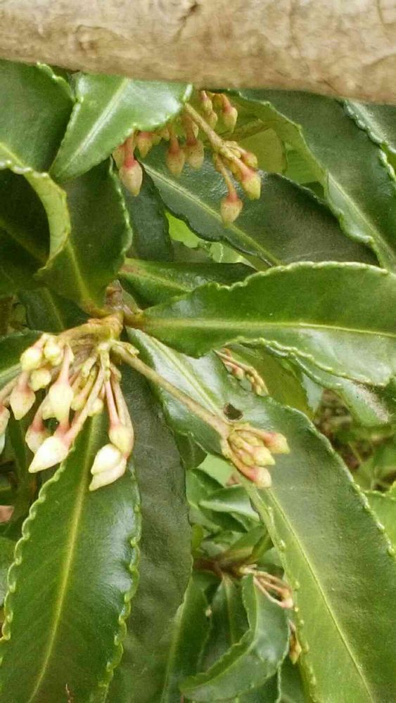 六月半ば葉のたぶん下に?か上に花をつけ出した千両か、★万両(こっちかな)の木、暑くなる前に花を用意してるのか実は下に付きそうだが?