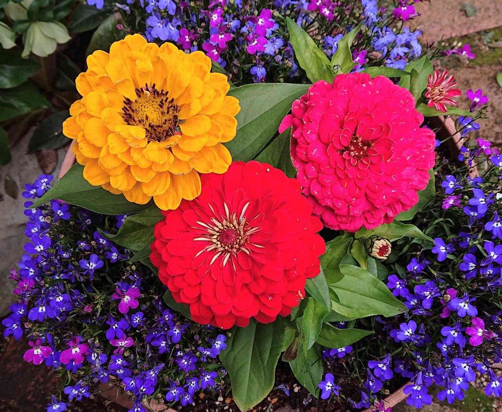 黄色とピンク色のジニアと反対色の青・紫色のロベリアの寄せ植えしました。派手な色の取り合わせの一鉢になっちゃいました😲。朝見ると、目が覚めます👀🎶。