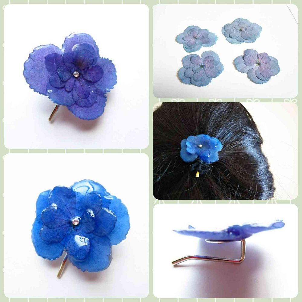 以前品種名をお聞きした紫陽花の押し花を着色したレジンでコーティングし、ポニーフックに仕上げました。