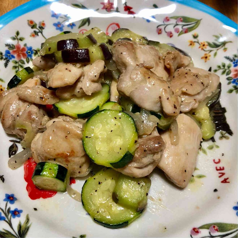 今日は鳥もも肉とズッキーニとナスと新玉ねぎのレモンペッパー焼き。