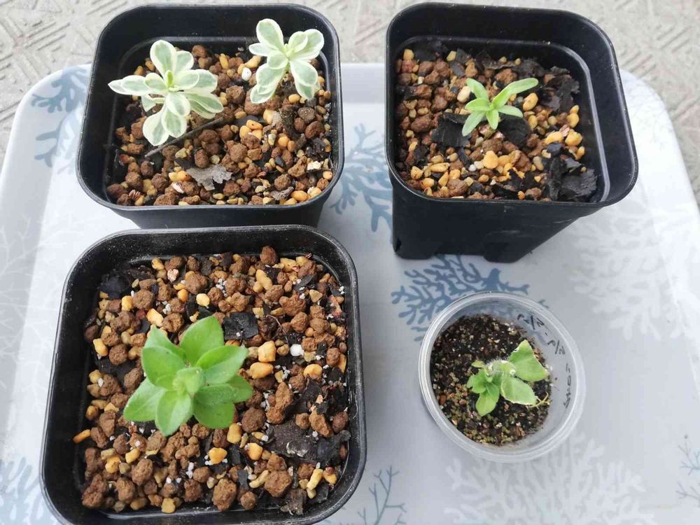 左上のシレネ2つと左下ペチュニアモンローウォークベールヴァルド1つは無事に発根して鉢上げ😊
