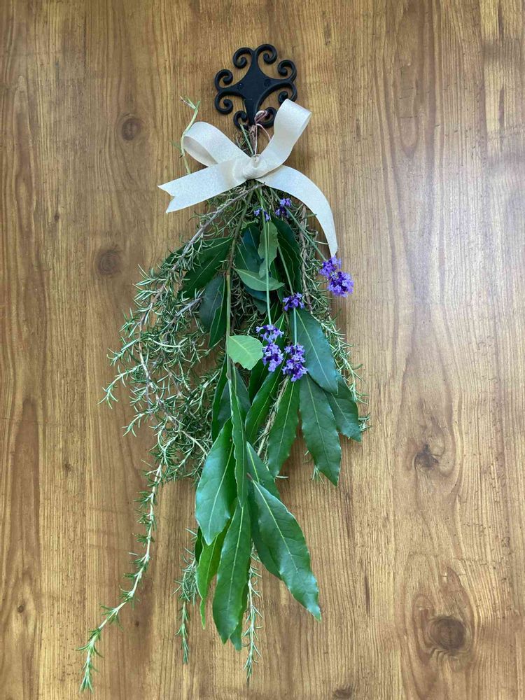 切り落とした月桂樹とローズマリー、ラベンダーで、三年生の孫とスワッグやリースをたくさん作りました🌿