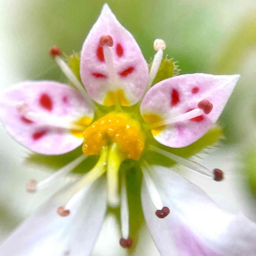 ユキノシタ、ひとつの花で、デザイン画のようですね!花びらの大きさも違って不思議な花だなぁと思っていました。なかなかアップがうまく撮影できない中、みせていただきうれしいです。