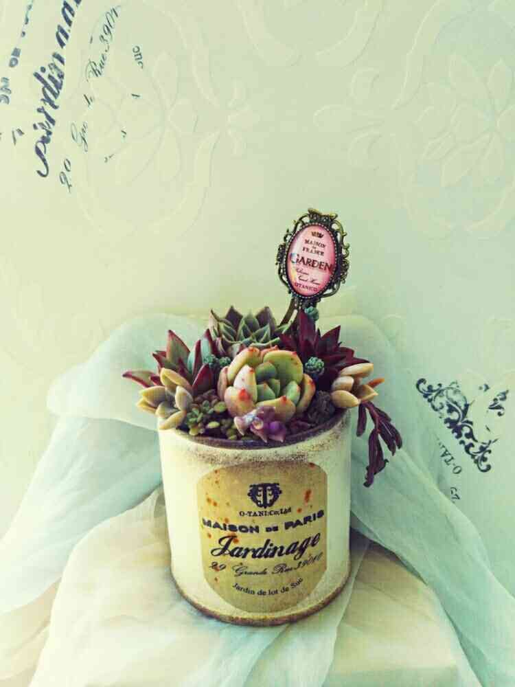 嬉しくって、早速、以前に寄せ植えしていた、リメ缶と、オマケのピックも一緒にななさん3点セットで、パチリ🎵📷