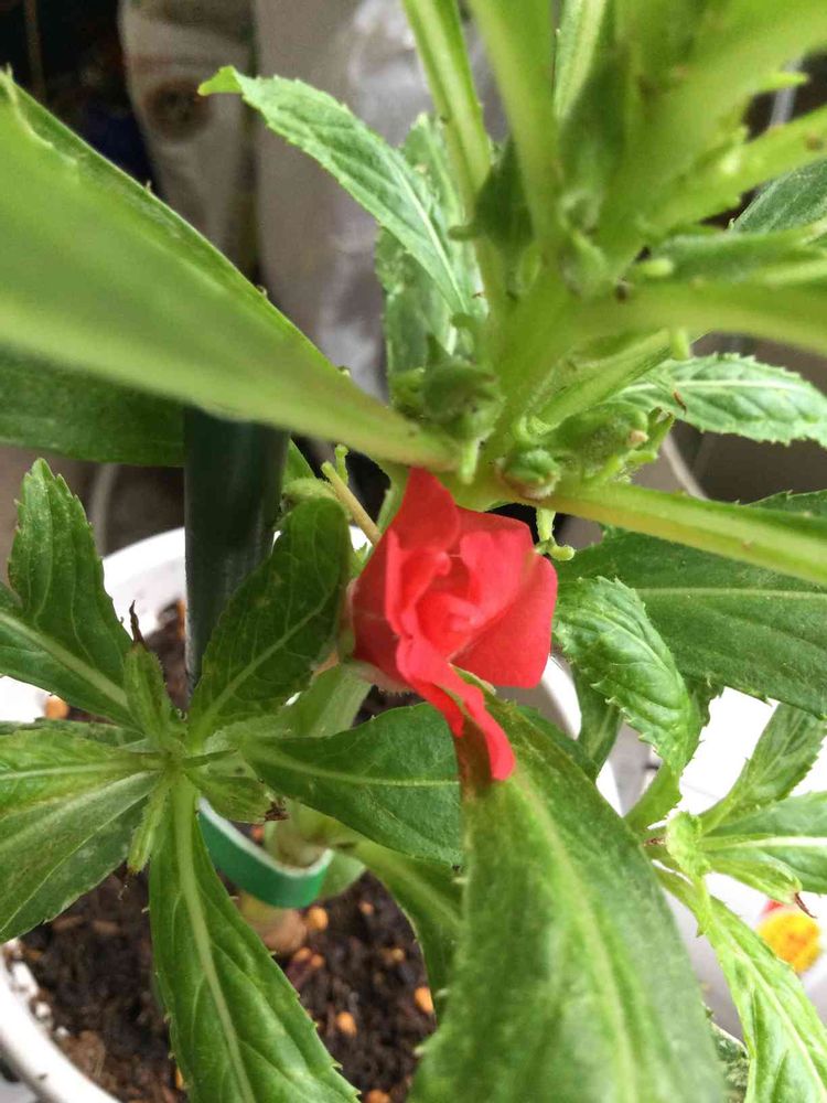 鳳仙花が咲いてきました。葉の影に赤い色が見えたので覗いてみたら、咲きそうでした。