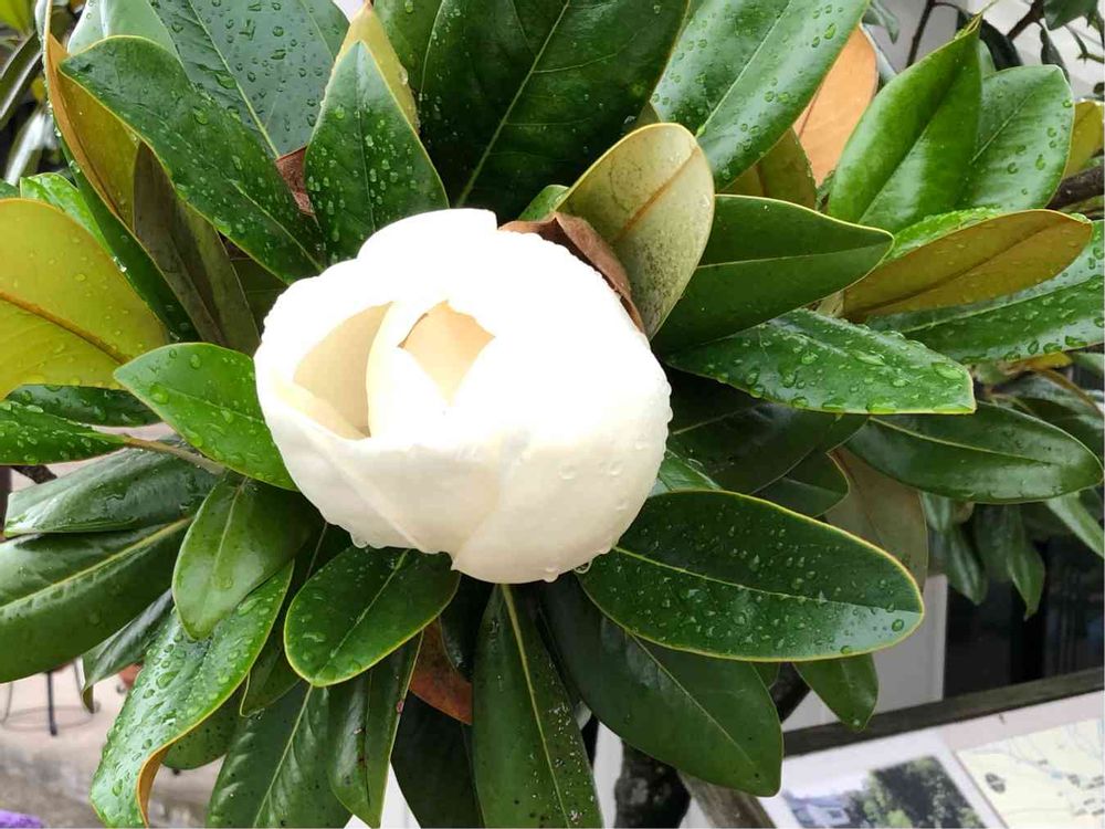 開きかけの泰山木の花はじめてです😆背が高いので開ききった花を下から見てました。時には落ちてきたポッテリした花で気づいたり😅