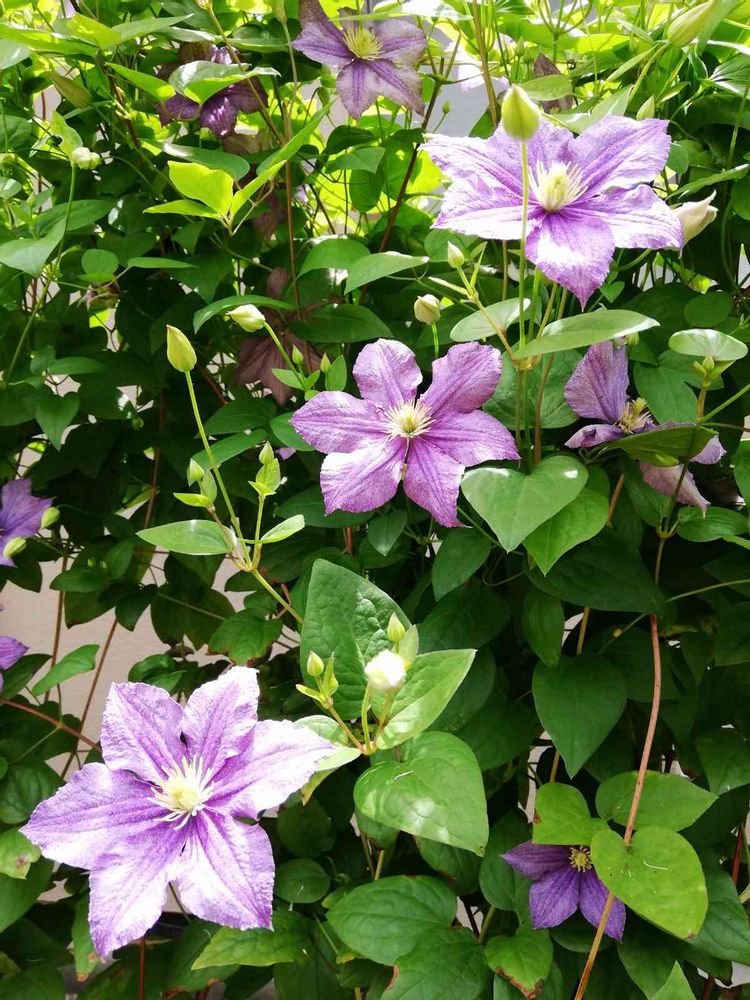 クレマチス・ジュエリーローズが盛んに咲いてくれています。こちらは地植え。この季節だけ、両端に高い支柱を立て麻紐で格子状にし絡ませてあげます。もう…高さも限界💦ですが、丈夫で一面にたくさんの花を咲かせてくれます💜🌱