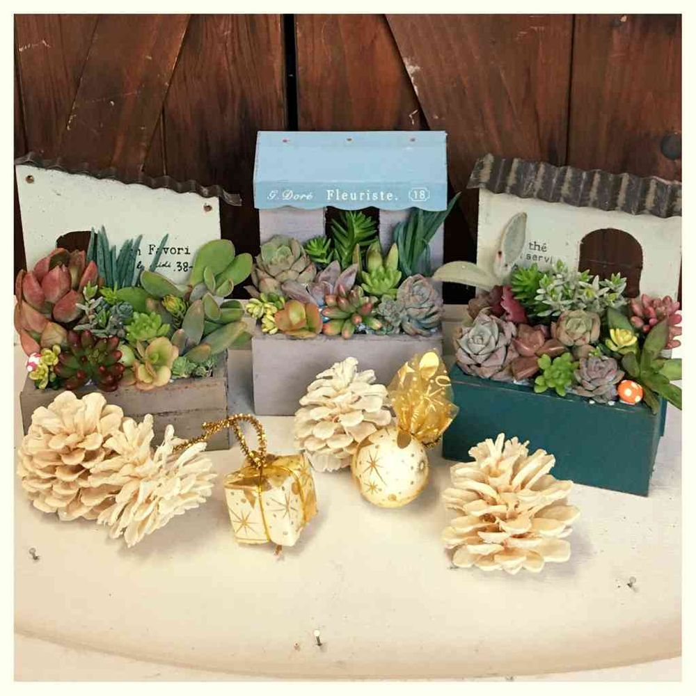 白い松ぼっくりとオーナメントがいいですね。白で統一すると多肉とのいろの違いで絵になりますねー❤️