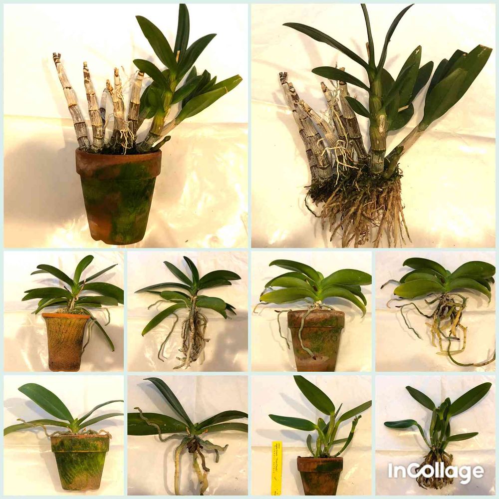 葉を落とした旧バルブ6本、葉のあるバルブ3本、