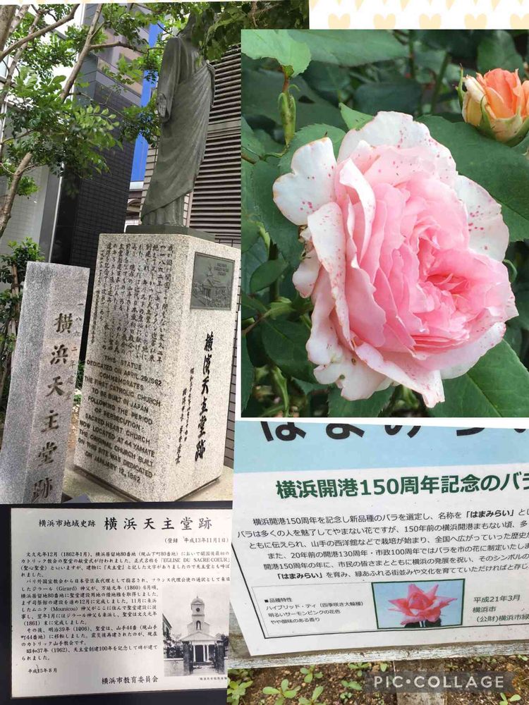 今日は石🪨の日なので、いつも通っているコンビニ🏪前にある石碑。横浜天守堂跡地のキリスト像。そして、家のそばの公園に咲いているバラ🌹、ハマミライです。^o^。