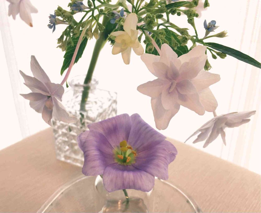 私には、トルコキキョウちゃんが、ガクアジサイさんとお話ししているように見えます🌸💠💕