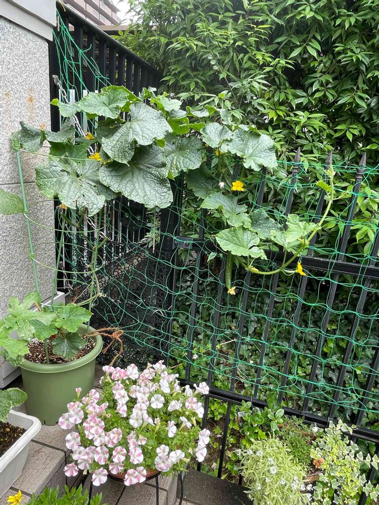 きゅうり🥒の枝が支柱より伸びてしまったため、フェンスにネットをはり、枝がネットにうまく誘引してくれました😉